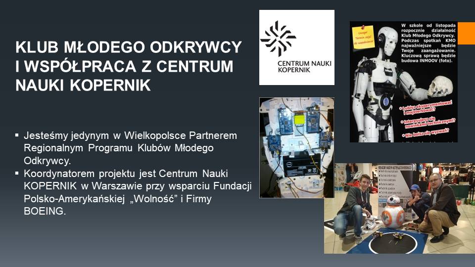 Nasza placówka została Partnerem Regionalnym Programu Klubów Młodego Odkrywcy. Koordynatorem projektu jest Centrum Nauki KOPERNIK w Warszawie przy wsparciu Fundacji Polsko-Amerykańskiej „WOLNOŚĆ” i Firmy BOEING.