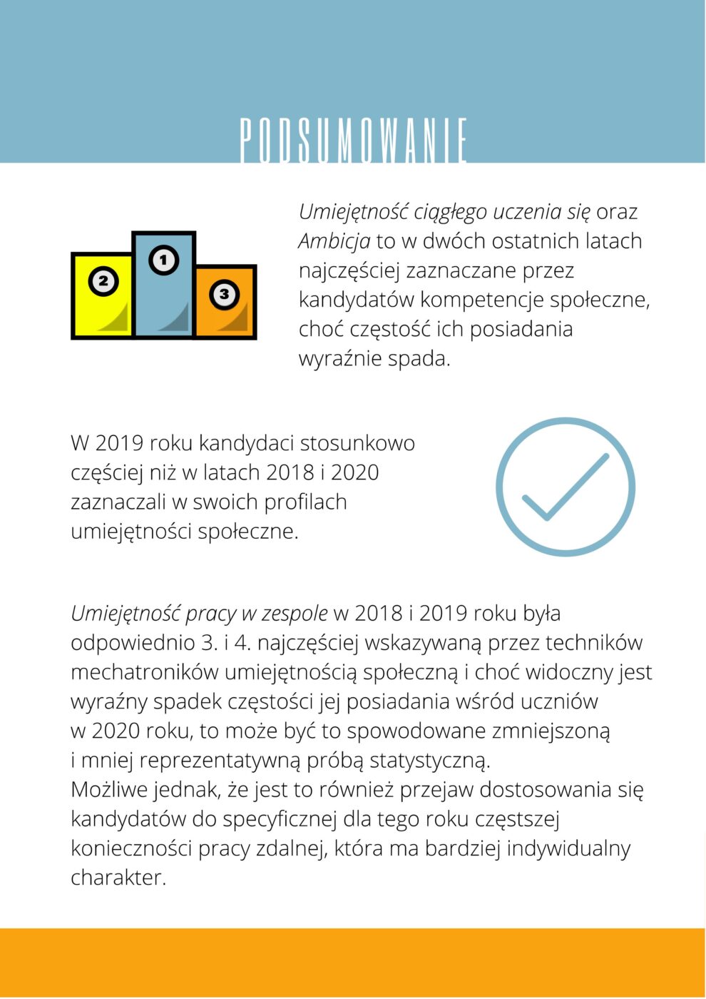 Kompetencje społeczne wiążą się z umiejętnością życia w zbiorowościach ludzkich, a przede wszystkim z umiejętnością współpracy i komunikacji. W badanym okresie do najczęściej wskazywanych umiejętności należą: ciągłe uczenia się, ambicja oraz umiejętność pracy w zespole. Ta ostatnia odnotowuje spadek – może jednak być to spowodowane dostosowaniem się kandydatów do pracy zdalnej. Zawarty w raporcie pakiet wskazówek, przygotowany zarówno dla pracodawców, jak i kandydatów korzystających z system.zawodowcy.org, przyczynić się powinien do zwiększenia obu stron w procesie rekrutacyjnym.