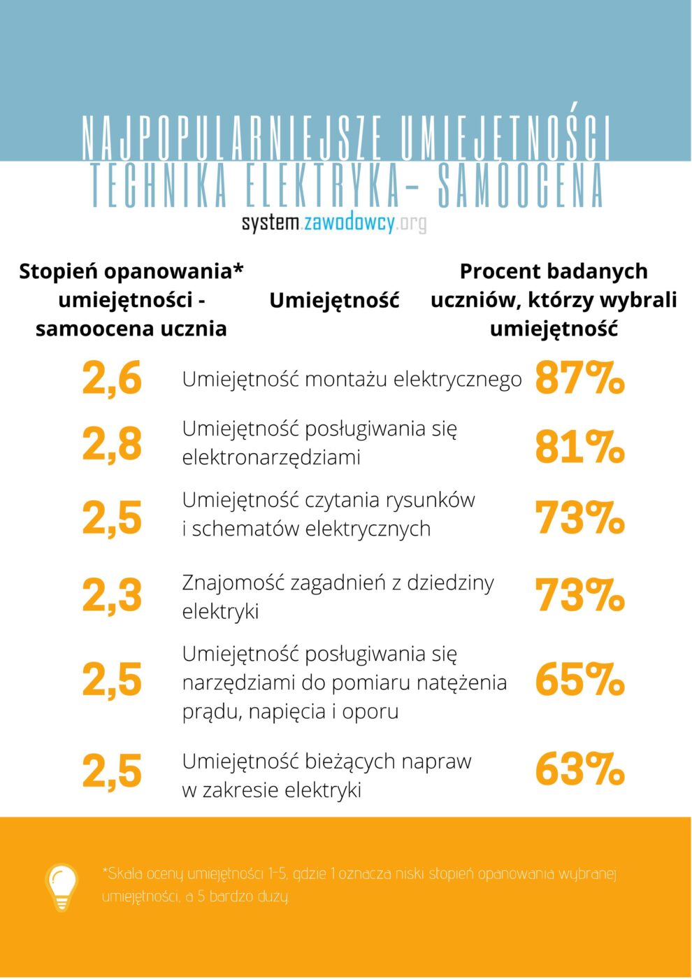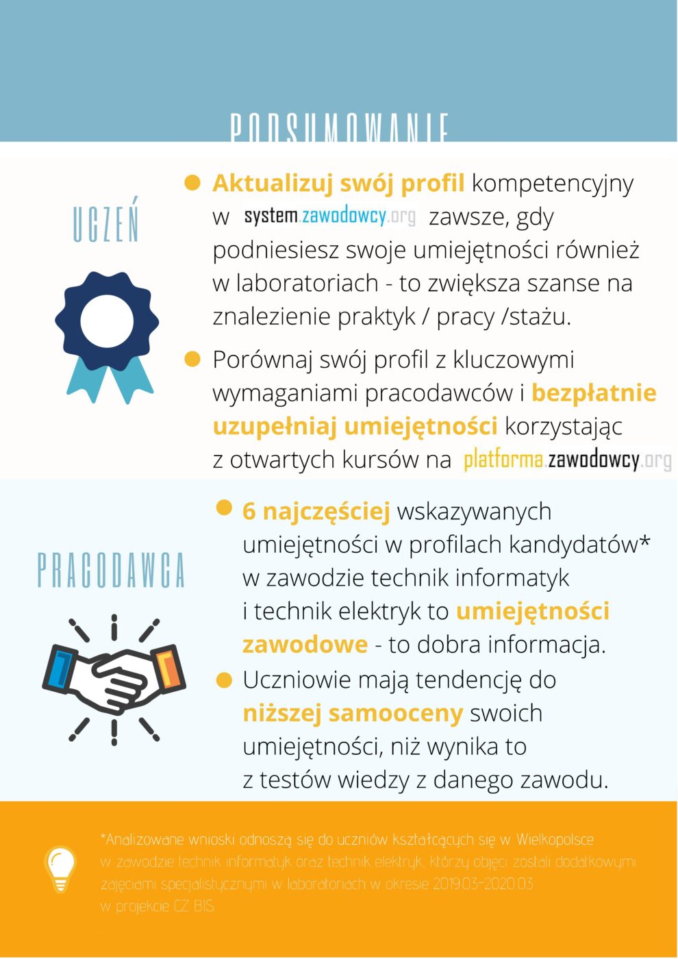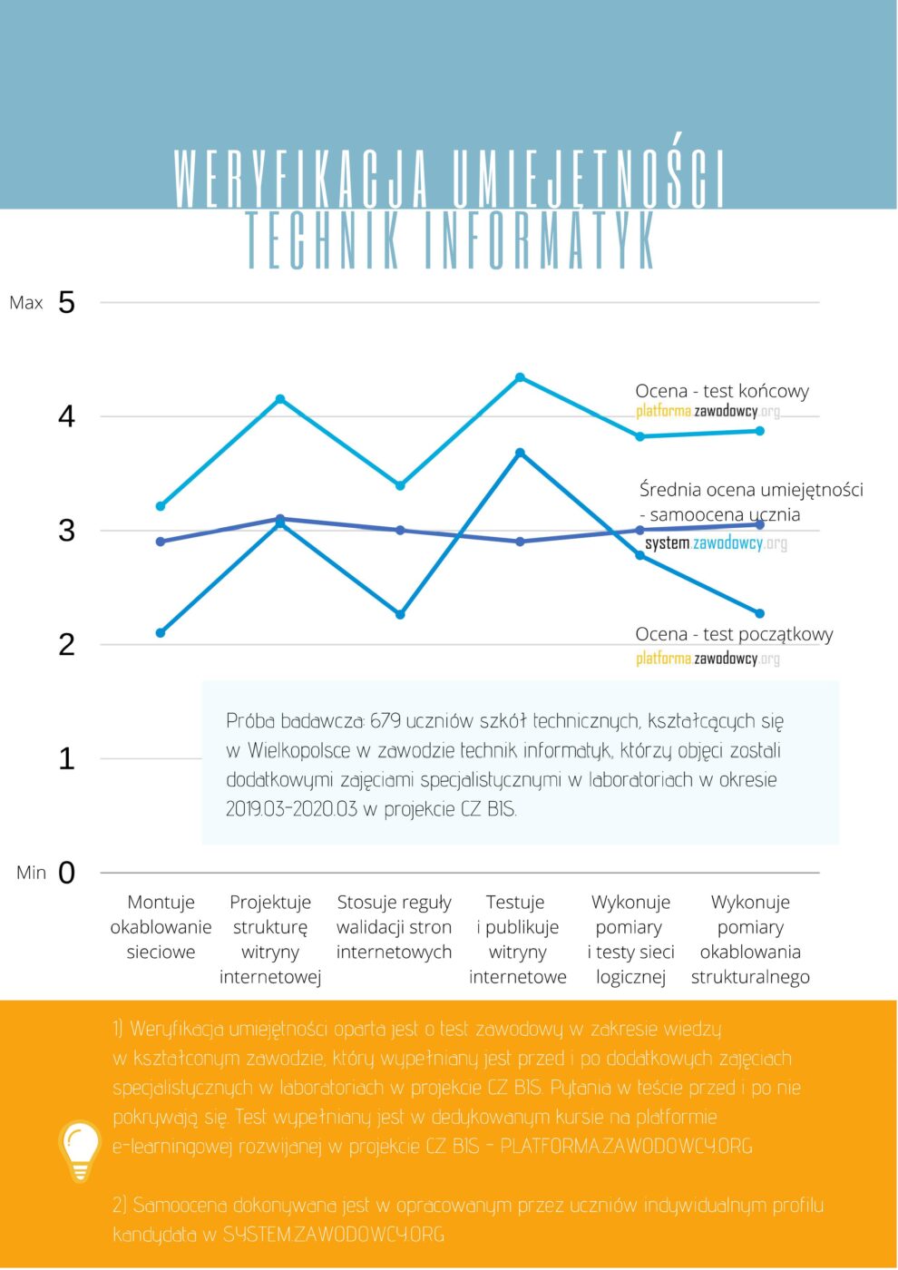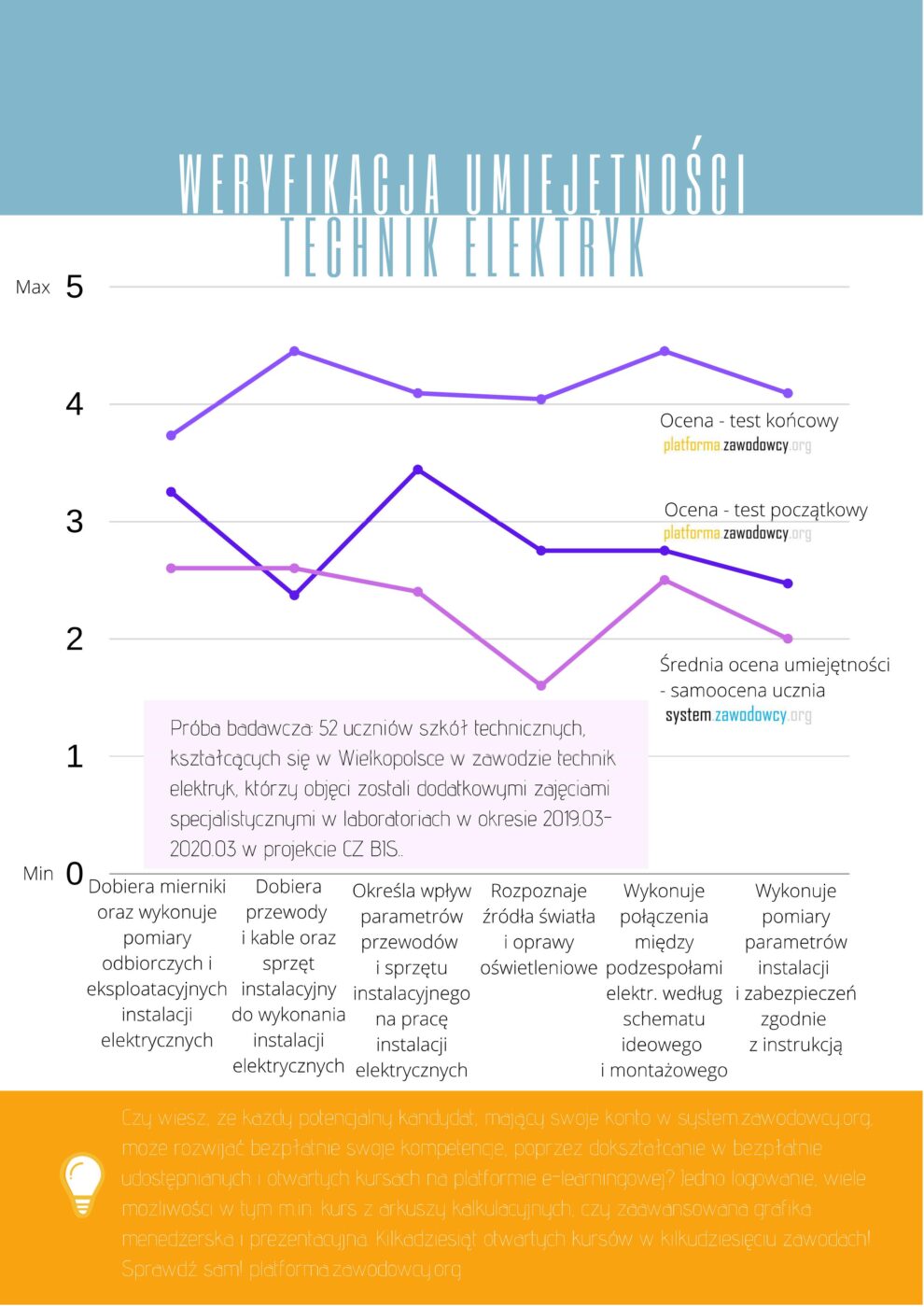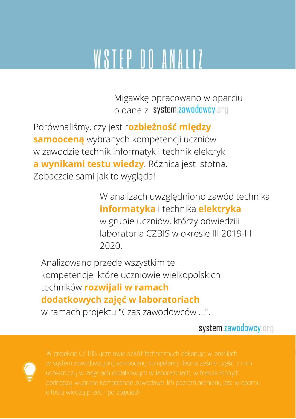 w bieżącej migawce, opracowanej w oparciu o dane z system.zawodowcy.org, porównano rozbieżności pomiędzy samooceną wybranych kompetencji uczniów wielkopolskich techników w zawodzie informatyk i technik elektryk, a wynikami testu wiedzy. Analiza została wykonana w grupie uczniów, którzy objęci zostali dodatkowymi zajęciami specjalistycznym w laboratoriach w ramach projektu CZBIS w okresie marzec 2019 – marzec 2020.
